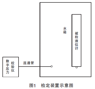 該檢定裝置如圖1所示,包括數(shù)字壓力校驗儀、水箱、連通管、水箱、各種液位計接口和固定裝置。
