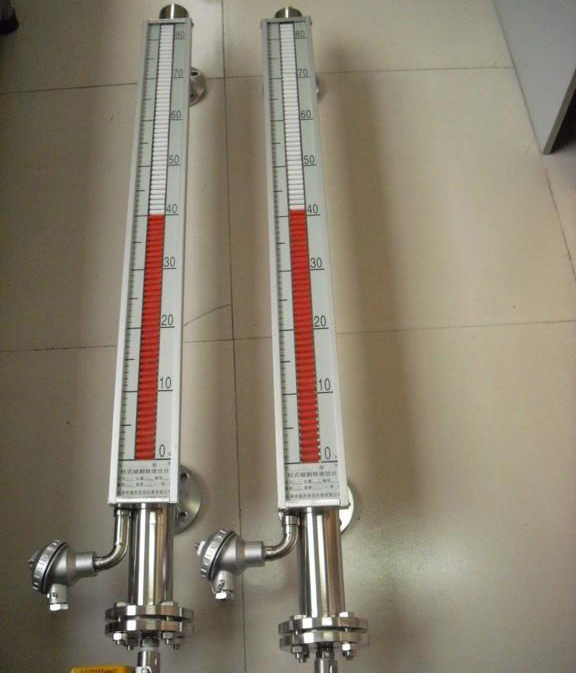 液位計根據(jù)浮力原理,浮子在測量管內(nèi)隨液位的升降而上下移動,浮子內(nèi)的永久磁鋼通過磁耦合作用,驅(qū)動紅、白色翻柱翻轉(zhuǎn)180’液位上升時,翻柱由白色轉(zhuǎn)為紅色,下降時,翻柱由紅色轉(zhuǎn)為白色,從而實現(xiàn)液位的指示。