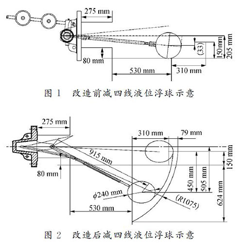 針對減四線液位測量進行大轉(zhuǎn)角、切割集油箱改造,有效量程大于設(shè)計量程的80%,其改造測繪圖如圖2所示。改造后,安裝支架120 mm,插入深度為1?。保担担恚?,實際測量液位達450mm,儀表接液部位全部選用317材質(zhì)。轉(zhuǎn)軸—杠桿套筒、杠桿套筒—連桿、浮球—連桿的固定連接節(jié)點及加工焊接坡口增加焊接強度;對于活動節(jié)點,采用專用銷子固定。