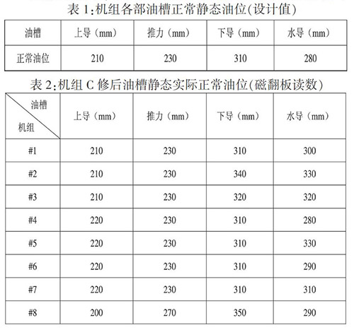 機(jī)械油位無定值,機(jī)組C修時油槽實(shí)際加油油位與設(shè)計靜態(tài)油位存在偏差,實(shí)際靜態(tài)正常油位詳見表2。