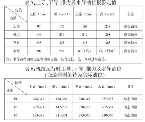 未給出實(shí)際運(yùn)行中動態(tài)油位報警定值,磁開關(guān)安裝位置也是按照表5來調(diào)整的,機(jī)組運(yùn)行時油槽內(nèi)實(shí)際油位(表6,變送器測值加上表4偏差值)波動大,各部動態(tài)油位已超過磁開關(guān)定值,故CCS會頻繁報警。