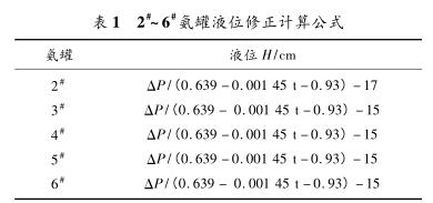 因液氨密度受溫度影響大,且每個氨罐的保溫效果也有差異,故如需準確測量氨罐液位,必須引入溫度測量。對2#~6#氨罐分別進行卸壓,并引入熱電偶遠傳至DCS系統(tǒng),對密度進行修正,修正公式為Q液=0.639-0.00145t。經(jīng)過以上修正,2#~6#氨罐液位修正計算公式如表1所示。