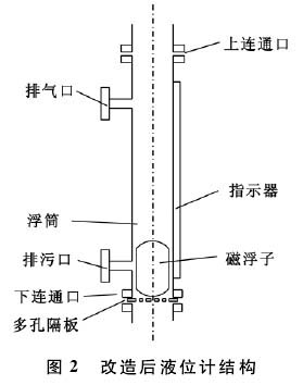 (3)方案3。改造現(xiàn)有的液位計,采用上下端日連接,上過程進(jìn)日改為排氣口,下過程進(jìn)日改為排污口,原安裝浮子法鑄和排氣閥接日改為連通日,在下部增加一個多孔隔板,保證浮子不進(jìn)人工藝管線,同時保證液體的正常流動。在保證不改變液位計結(jié)構(gòu)情況下,將液位計與工藝管線連接。此方案優(yōu)點(diǎn)是花費(fèi)少,不閑置設(shè)備,并且還能達(dá)到液位計與管線清理同步,實現(xiàn)維修與檢修同步。
