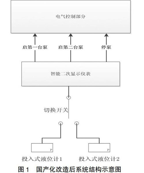 如圖1所示,國產(chǎn)化改造后,地面排水控制系統(tǒng)用防凍液液位計測量地坑液位,用智能二次儀表接收防凍液液位計的信號,并根據(jù)設(shè)定的液位報警值向電氣控制部分發(fā)出啟動和停運排水泵信號,控制系統(tǒng)配置了2個防凍液液位計,通過1個轉(zhuǎn)換開關(guān),可以選擇投入使用的液位計,也可對比兩個液位計的測量數(shù)據(jù),通過定期巡檢發(fā)現(xiàn)液位測量故障。
