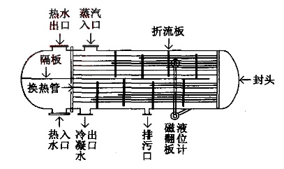 如下圖所示,壓力為0.4~0.6MPa的飽和蒸汽由蒸汽入口進(jìn)入管式換熱器,經(jīng)折流板、隔板上下流通,*終其大部分熱量被熱水吸收,形成凝結(jié)水從凝結(jié)水出口流出。一次熱水(溫度約為20℃)從熱水入口流進(jìn),經(jīng)過(guò)從左向右的換熱管流至封頭,在經(jīng)過(guò)從右向左的換熱管從熱水出口流出,變成二次熱水,二次熱水流向系統(tǒng),放熱后流回?fù)Q熱站循環(huán)水泵入口,經(jīng)加壓后再次流向熱水入口,如此反復(fù)循環(huán)加熱,*終向用戶提供80~130℃的高溫?zé)崴?/div>