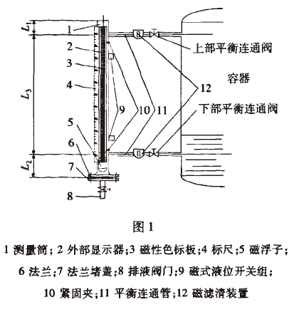 1測(cè)量筒;2外部顯示器;3磁性色標(biāo)板;4標(biāo)尺;5磁浮子;6法蘭:7法蘭堵盞;8排液閥門;9磁式液位開關(guān)組;10緊固夾;11平衡連通管;12磁濾清裝置元件上磁性材料的作用而發(fā)生翻轉(zhuǎn)。翻板或翻柱上涂有兩種視覺區(qū)分較大的顏色,觀看液位顯示器中翻板或翻柱的顏色分界線就可知容器中液位的情況。測(cè)量筒垂直方向的上下兩端安裝有閥門,其中上閥門用于平衡氣壓,下閥門用于放走殘留液體。