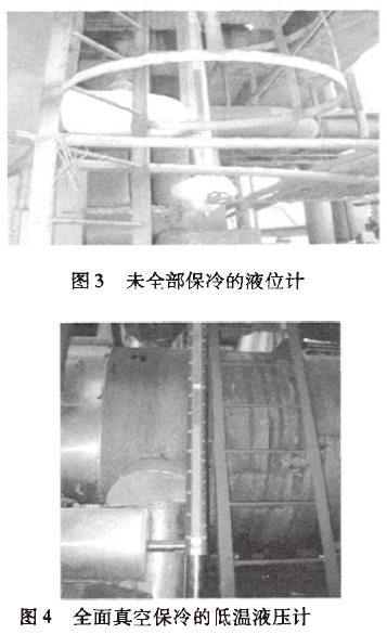從圖3和圖4可見,平衡連通管無真空保溫層的液位計(jì),有冷凝冰塊出現(xiàn)。加了之后,冷凝冰塊全部消失。