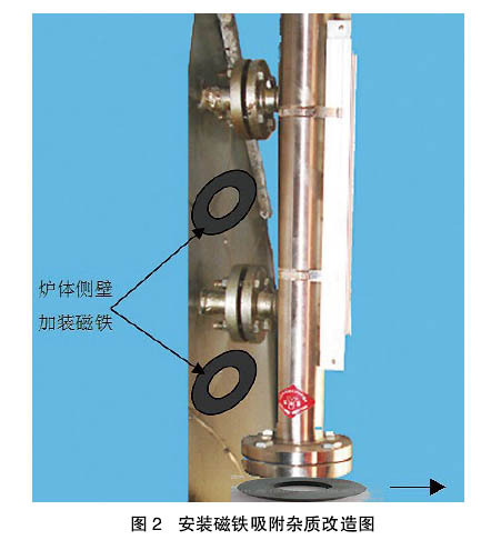 在爐體側(cè)壁靠近連通管的位置加裝4塊環(huán)形磁鐵
