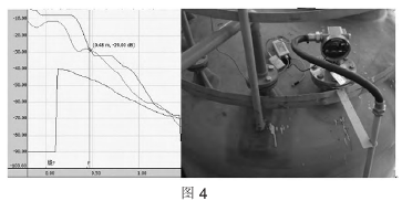 圖4為鹽酸配置槽正在加稀釋水且液位達到2.7m(量程3m)時回波包絡(luò)線圖。此時,測量值跳動明顯。分析原因:雷達液位計無明顯回波信號,且回波信號波動較大。該液位計在中低液位計加料時,測量值準(zhǔn)確、穩(wěn)定,但高液位加稀釋水時,加料口距離雷達液位計距離過近,飛濺起的水花對回波產(chǎn)生了較大的干擾,從而影響了測量。