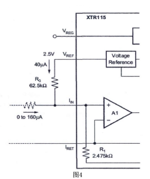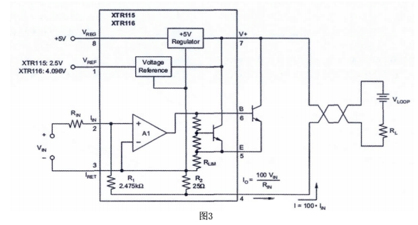 把傳感器輸出的不同電壓轉(zhuǎn)換成標(biāo)準(zhǔn)的4-20ma輸出,可采用不同的電路形式。成本低的可采用分立器件,但是為了達(dá)到比較高的精度,要保證相應(yīng)器件的匹配程度,調(diào)試也比較麻煩。TI公司推出的XTR 系列工業(yè)傳感器專(zhuān)用的4-20ma的一體化變送器集成電路,采用該系列產(chǎn)品設(shè)計(jì)的變送器成本低,精度高,調(diào)試簡(jiǎn)單。經(jīng)過(guò)選擇決定使用XTR115完成設(shè)計(jì)。內(nèi)部結(jié)構(gòu)如圖三: