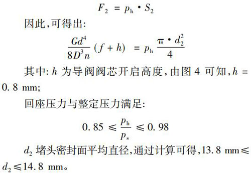 當系統(tǒng)壓力降低到回座壓力時,導(dǎo)閥彈簧要克服堵頭密封面處的密封力將其打開,此時應(yīng)滿足: