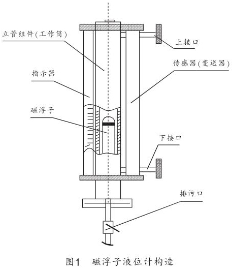 遠傳式側裝磁翻板液位計由磁浮子、工作筒、指示器、遠傳變送器組成,如圖 1 所示。