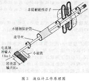 其工作原理是利用磁場脈沖波,測(cè)量時(shí)液位計(jì)的頭部發(fā)出電流“詢問脈沖”,此脈沖同時(shí)產(chǎn)生磁場,沿波導(dǎo)管內(nèi)的感應(yīng)線向下運(yùn)行,在液位計(jì)管外配有浮子,浮子可隨液位沿側(cè)桿上下移動(dòng),浮子內(nèi)設(shè)有一組永久磁鐵,其磁場與脈沖產(chǎn)生的磁場相遇則產(chǎn)生一個(gè)新的變化磁場,隨之產(chǎn)生新的電磁“返回脈沖”,測(cè)定“詢問脈沖”和“返回脈沖”的周期便可知道液位的變化。因此,磁致式液位計(jì)是以浮子為測(cè)量元件通過磁耦合的變化傳遞到指示器,使指示器能夠清晰地指示出液位的高度。