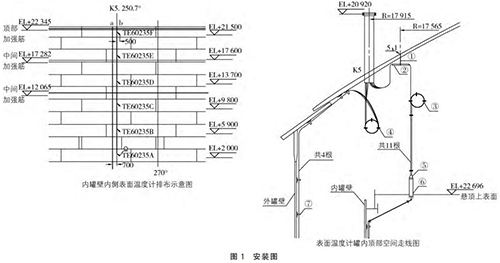 以昆侖能源華油天然氣四川廣安液化天然氣2萬方儲罐為例,在安裝多點(diǎn)溫度計過程中,內(nèi)罐底部溫度熱電阻需要從內(nèi)罐浮頂進(jìn)入罐內(nèi),沿罐壁垂直向下固定在罐底部。如需夾層底部溫度測量,則需要將溫度熱電阻沿外罐壁垂直而下,固定在罐底夾層的氮?dú)夤苌?,每間隔4m布置1個電纜固線器,如圖1所示。