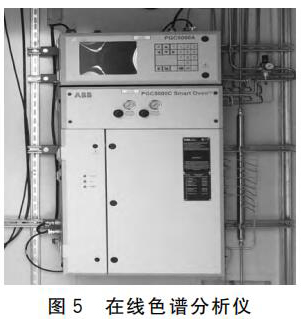 (1)利用電加熱氣化取樣探頭,把測量介質(zhì)引入在線色譜分析儀,實(shí)時分析氣體組分。在使用在線色譜分析儀(圖5)時,需要配合標(biāo)氣及載氣,提前對色譜進(jìn)行標(biāo)定。預(yù)處理部分,先把每個取樣管路取下來吹掃5~10min(取樣探頭壓力設(shè)定為2~3kg),保證沒有雜質(zhì)摻入,然后接上管線。要注意定期檢查色譜載氣(H2或者N2)使用情況,及時更換。如果更換不及時,在使用完之前,*好停用色譜,防止燒壞檢測器。