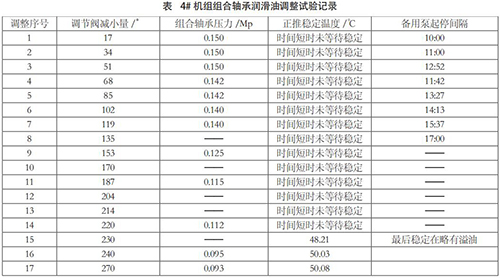 (4)方案四:調(diào)整組合軸承潤滑油量經(jīng)過主機制造廠設(shè)計部計算復(fù)核,認為現(xiàn)有油泵有可能滿足冷卻要求。經(jīng)過與電廠溝通,聯(lián)合制定了減少組合軸承用油量的試驗方案。主要措施為:在組合軸承供油管調(diào)節(jié)閥后組合軸承前增加一壓力表,用于監(jiān)視組合軸承供油壓力。機組在滿負荷運行條件下,分階段逐步調(diào)整節(jié)流閥減少供油量,監(jiān)視記錄組合軸承供油壓力和組合軸承溫度,直到單臺油泵滿足用油量略有余量、備用泵處于備用狀態(tài)下,正向推力瓦*高溫度控制 55℃以內(nèi)。*后恢復(fù)單冷卻器運行和環(huán)境溫度*高條件下檢驗軸承溫度。