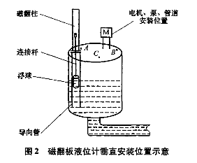 圖2中,B點(diǎn)靠近電機(jī)和泵,襯四氟磁翻板液位計(jì)安裝在此處既影響電機(jī)及泵的檢修,又因泵附近液位的環(huán)流波動(dòng)較大,對(duì)浮子導(dǎo)向管沖刷嚴(yán)重,故B點(diǎn)不合理;C點(diǎn)處因有管道通過(guò),不便維護(hù)且影響管道和泵、電機(jī)等的起吊更換,故也不能選擇C點(diǎn);A點(diǎn)遠(yuǎn)離泵和電機(jī),且有足夠的空間安裝翻板,便于維護(hù),所以A點(diǎn)較為合適。