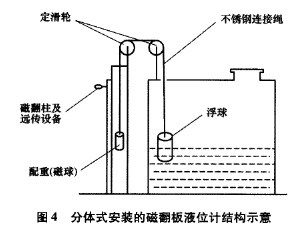 分體式襯四氟磁翻板液位計(jì)的安裝步驟如下:①通過(guò)計(jì)算浮力和配重,在槽體頂部合適位置安裝定滑輪,在槽外合適位子安裝磁翻板傳感裝置;②用直徑為3mm的不銹鋼繩連接浮子和配重,鋼繩長(zhǎng)度根據(jù)液位來(lái)計(jì)算。這里特別要注意,磁翻板要反向安裝。