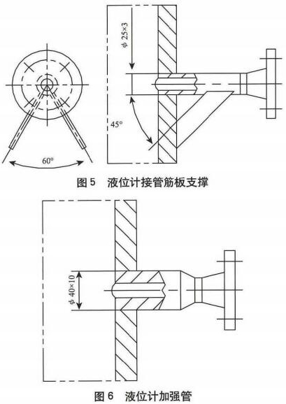 圖5是泄漏酸堿液位計(jì)接管結(jié)構(gòu),雖然必25mmx35mm接管的開孔補(bǔ)強(qiáng)滿足GB150-1989標(biāo)準(zhǔn)[11“開孔不另行補(bǔ)強(qiáng)”的要求,但卻不符合現(xiàn)行標(biāo)準(zhǔn)GB/T150-2011的“開孔不另行補(bǔ)強(qiáng)”要求。因?yàn)?,兩?biāo)準(zhǔn)雖然限制的設(shè)計(jì)壓力(<2.5MPa)與接管外徑(<89mm)等條件相同,但是后者改版標(biāo)準(zhǔn)卻對接管壁厚及腐蝕裕量增加了要求,這是合理的改進(jìn)完善。對于本例的425mm接管,滿足GB/T150-2011的“開孔不另行補(bǔ)強(qiáng)”條件的管壁厚度至少應(yīng)為5.5mm(按標(biāo)準(zhǔn)規(guī)定當(dāng)腐蝕裕量為1mm時,接管厚度應(yīng)不小于3.5mm)。所以,按HG/T20583-2011對小接管避免彎曲而推薦的加強(qiáng)結(jié)構(gòu)優(yōu)先選用加強(qiáng)管形式建議將液位計(jì)接管更改為圖6的加強(qiáng)管結(jié)構(gòu)。這樣不但解決了小接管的開孔補(bǔ)強(qiáng)和防彎曲加強(qiáng)問題,也可以使小接管的設(shè)計(jì)使用年限與罐體一致,而且便于保證小接管與罐體采用插人式全焊透角焊縫的焊接質(zhì)量。