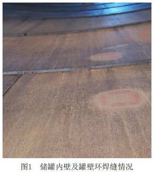 儲(chǔ)罐結(jié)構(gòu)型式為拱頂罐,罐壁的環(huán)焊縫為搭接結(jié)構(gòu),其罐壁的焊縫均沒(méi)有進(jìn)行處理,有一定的焊縫余高,罐體內(nèi)直徑隨著高度的增加直徑在變小。儲(chǔ)罐原為原油儲(chǔ)罐,雖然經(jīng)過(guò)蒸汽吹掃,罐壁上仍附著油污,罐內(nèi)的防腐層破壞嚴(yán)重。儲(chǔ)罐在制造時(shí),對(duì)鋼板的內(nèi)表面要求處理的粗糙度等級(jí)不高,使內(nèi)壁殘留許多小的焊瘤、焊渣等,該類(lèi)殘留物部分有鋒利的銳角。其具體情況如圖1所示。