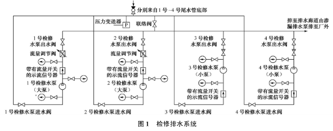 桐柏電站的檢修排水系統(tǒng),共設4臺排水泵,如圖1所示,1號、2號檢修水泵(大泵)用于排空引水隧洞、蝸殼、尾水管、尾水隧洞內的水;3號、4號檢修水泵(小泵)用于球閥、上下庫閘門等的滲漏排水。每臺檢修水泵均配置逆止閥、壓力表和帶流量開關的示流信號器,在1號、2號水泵出水管處各安裝了一個流量調節(jié)閥。系統(tǒng)中共有2根總管,一根為水泵的總吸水管,包括從每臺機組尾水管底部至總管的支管,總吸水管和部分支管及管路上的操作閥門布置在廠房管路廊道中;另一根為總排水管,可將水排至滲漏集水井中,再經滲漏排水泵排至下庫。