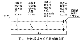 它結構是利用旁通管的原理,主導管內的液位和尾水管內的液位高度一致,根據阿基米德定理,磁性浮子在液體中產生的浮力和重力平衡,當尾水管中的水位升降時,液位計主導管內的浮子也隨之升降,浮子內的永久磁鐵通過磁耦合驅動指示器內的翻板指示器,當液位上升或下降時,翻板指示器由白色翻轉為紅色,或由原來的紅色翻轉為白色,指示器的顏色改變的高度就是被測水位的實際高度,從而實現(xiàn)液位的現(xiàn)場指示,以供運行人員目測尾水管的實時水位。安裝于液位計管壁外側的磁記憶開關,可多點設置、滑動調整位置,提供了液位開關量報警功能。在裝置的頂部安裝了一個自動排氣裝置,當主導管內液位上升時能夠自動的排氣,下降時能夠按時補氣?,F(xiàn)場安裝耐高溫磁翻板液位計時,裝置標尺的0位,對應的實地高程為EL.40.0m。浮子開關設定5個水位動作值,檢修水位低開關量報警值對應的高程為40.3m;停止所有檢修水泵的開關量,所對應的高程為40.5m;啟動主用檢修水泵的開關量,所對應的高程為40.9m;啟動檢修水泵主用泵的開關量,以及要求手動啟動大泵,并作為水位高報警上送上位機,所對應的高程為41.1m與41.2m,兩個開關量并列接入。全部開關量分別送入PLC,如圖3所示。