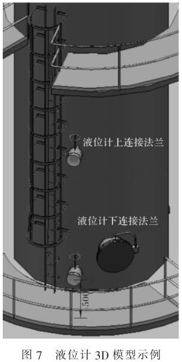如圖 7 所示,以某項(xiàng)目的 3D 模型為例,防腐磁翻柱液位計(jì)下連接法蘭距離平臺(tái) 0.5m , 該防腐磁翻柱液位計(jì)下法蘭至下排放口(常用垂直形式)約為 0.57m ,為避免平臺(tái)開(kāi)孔,應(yīng)選擇下排污為水平的形式,約為 0.32m。因此,在設(shè)計(jì)階段,應(yīng)通過(guò) 3D 模型核對(duì)每臺(tái)液位儀表的安裝位置及空間, 選擇合理的液位計(jì)安裝形式,避免施工時(shí)儀表安裝不下。