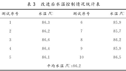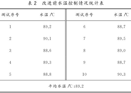 根據(jù)生產(chǎn)標準設(shè)定水溫為85℃,進行了10次測試,平均水溫為89.2℃(見表2),超出了設(shè)定溫度4.2℃。