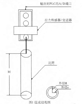 沉筒式液位計(jì)主要由拉力傳感器、變送器及沉筒組成,拉力傳感器內(nèi)部貼有電阻應(yīng)變片,通過(guò)信號(hào)線將變送器輸出的標(biāo)準(zhǔn)電流信號(hào)送到PLC的A/D輸入端口,用以進(jìn)行數(shù)據(jù)處理和遠(yuǎn)程控制。沉筒由上下兩端封閉的空心材料制成,并懸掛在拉力傳感器的受力端,其余部分投入到儲(chǔ)料罐中,拉力傳感器用法蘭盤(pán)或自帶螺紋固定在儲(chǔ)料罐的上方,結(jié)構(gòu)如圖1所示。