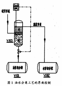 從圖中可以看出,這是一個連續(xù)化的生產(chǎn)過程。進(jìn)料管中的介質(zhì)是氯乙酸甲酯、水與甲醇的混合物,物料連續(xù)地從分離罐V103的中部進(jìn)料口流入罐內(nèi),在罐內(nèi)自然分層。上層的物料是水與甲醇組成的水性組分,下層的物料是以氯乙酸甲酯為主的油性組分,中間為混合層,工藝的要求是水性組分必須從溢流管道流出進(jìn)入V102儲罐;油性組分必須通過液位調(diào)節(jié)閥LV103進(jìn)入V101儲罐;同時為了防止物料過多,從分離罐頂部溢出,還需設(shè)置罐內(nèi)高液位時的報警。