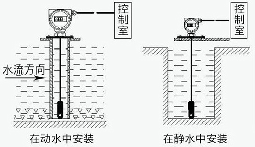 1、液位計(jì)安裝在靜止的深井、水池中時(shí),通常把內(nèi)徑Φ45mm左右的鋼管 (不同高度打若干小孔,以便水通暢進(jìn) 入管內(nèi))固定于水中,然后將投入式液位變送器放入鋼管中即可使用。