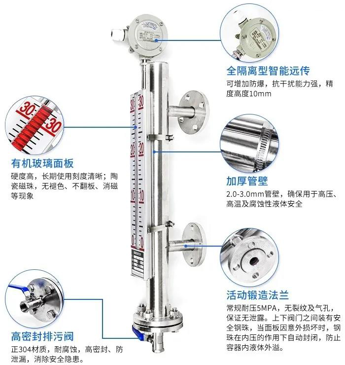 磁翻柱液位計是根據(jù)連通器和帶磁藕合基本原理而工作中的。做為一種普遍的液位儀檢測儀表,被普遍用于石油化工設(shè)備、倉儲物流運送等制造行業(yè)對各種各樣儲槽、儲罐、球形器皿和加熱爐等機器設(shè)備內(nèi)的物質(zhì)開展液位儀檢驗。相關(guān)磁翻柱液位計的基本原理,大家都廣為人知,但對其構(gòu)造和特性卻了解很少。那麼,磁翻柱液位計的構(gòu)造構(gòu)成和特性有什么呢?