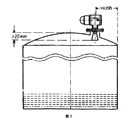?、倮瓤谔炀€的下端必須低于罐頂20mm以上,法蘭對(duì)水平面的誤差應(yīng)小于±0.5°,喇叭天線的中軸線應(yīng)保證與液面垂直,且距罐壁的*小安裝距離不能小于0.15H ( H為罐高)。(如圖2)