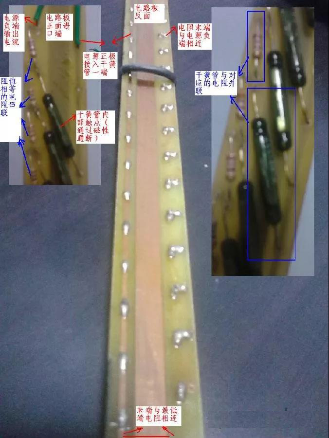電阻測量電路板安裝在一個不銹鋼的護(hù)套管內(nèi),電路板由相同阻值的電阻串聯(lián)而成,每個電阻的末端與電路板電源進(jìn)線間并聯(lián)一個干簧管,干簧管內(nèi)部有一個對磁性敏感的小觸點,遇到磁浮子的磁性時觸點吸合,此干簧管以下的所有電阻被短路,電路板的電阻值變小使變送器輸出電流變大。磁浮子上升或下降后干簧管的觸點在釋放,此點的電阻恢復(fù)功能。