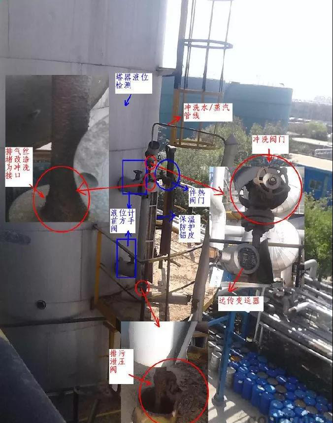 外裝式浮子液位計在實際清污中,對于現(xiàn)場安裝環(huán)境惡劣險峻不易拆卸的情況下,進(jìn)行維護(hù)改進(jìn)。利用測量筒上部的排氣絲堵,引進(jìn)蒸汽和清水管線,可以在不拆卸磁浮子的情況下進(jìn)行一定程度的除污清洗。