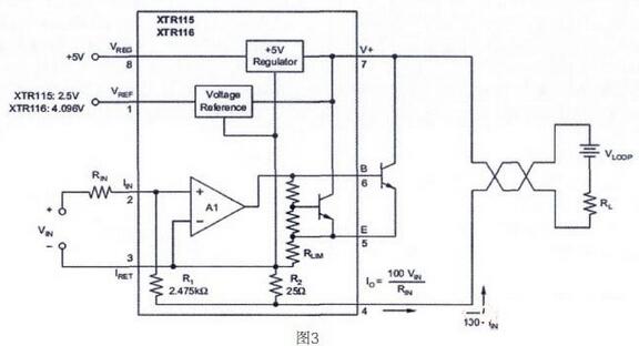 把傳感器輸出的不同電壓轉(zhuǎn)換成標(biāo)準(zhǔn)的4-20ma輸出,可采用不同的電路形式。成本低的可采用分立器件,但是為了達(dá)到比較高的精度,要保證相應(yīng)器件的匹配程度,調(diào)試也比較麻煩。傳感器專用的4-20ma 的一體化變送器集成電路,采用該系列產(chǎn)品設(shè)計的變送器成本低,精度高,調(diào)試簡單。經(jīng)過選擇決定使用完成設(shè)計。內(nèi)部結(jié)構(gòu)如圖三: