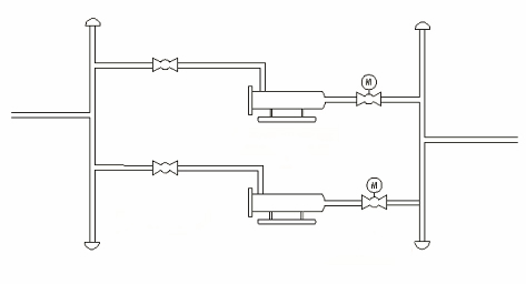 在輸氣站場根據(jù)下游用戶年設(shè)計輸氣量及檢維修需求通常設(shè)置兩臺臥式過濾分離器,運行時通常采用一用一備方式運行,氣量需求高峰時段達到單臺處理量時兩臺同時運行以滿足用戶氣量需求。過濾分離器在整個輸氣站場工藝流程中通過法蘭與管道相連,同時上下游均設(shè)置球閥(見圖1),其中下游球閥與電動執(zhí)行機構(gòu)相匹配使用,能實現(xiàn)遠程開關(guān)控制。在正常運行狀態(tài)下,在用過濾分離支路的上下游球閥處于完全開啟狀態(tài),備用過濾分離支路的上游球閥處于開啟狀態(tài),下游球閥處于關(guān)閉狀態(tài)。對于過濾分離器切換有兩種方式:一種是手動模式,另一種是自動模式。在手動模式下可由操作人員通過遠程和就地狀態(tài)下實現(xiàn)過濾支路流程切換;當(dāng)在自動模式下電動閥產(chǎn)生事故關(guān)斷時,則報警并自動選擇備用設(shè)備,打開備用支路的電動閥,關(guān)閉當(dāng)前支路的電動閥門,實現(xiàn)工作分離器和備用分離器的切換,上述過程由程序自動完成,不需人為干預(yù)。