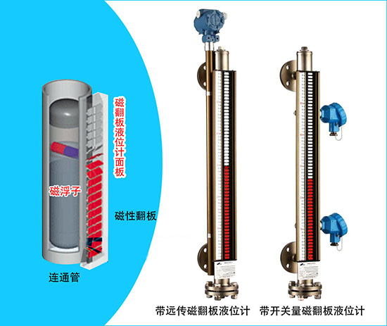 冷凝水液位計(jì)主要利用了浮力和磁性偶合來(lái)完成指示過(guò)程。當(dāng)液位上升時(shí),浮球在浮力作用下由下往上運(yùn)動(dòng),翻柱受到浮球中磁感應(yīng)力的作用翻轉(zhuǎn)180°,顏色由白色變?yōu)榧t色,面板上紅白翻柱的分界位置即為罐體中實(shí)際液位高度(如圖1),當(dāng)液位下降時(shí)浮球由上往下運(yùn)動(dòng),帶動(dòng)翻柱翻轉(zhuǎn),顏色由紅色變?yōu)榘咨?br />